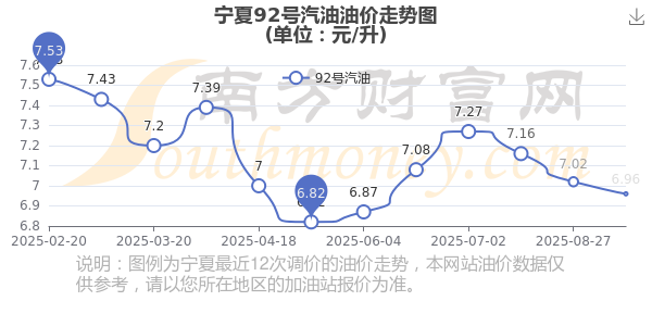 10月17日,宁夏92号汽油的价格是6.96元每升,本次的调整时刻为10月14日,比照前次的调整减了0.06元,减0.855%,10月27日24时为下一轮油价调整时刻,还有10.96天。